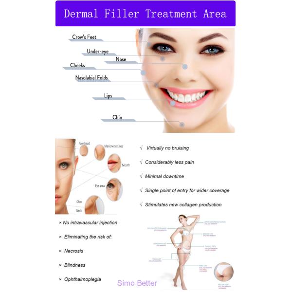 | Treatment areas | Forehead wrinkles Frown lines,Crow's-feet,Lip prints,Earlobe enlargement | Nasolabial folds,Cheeks padding,Nasolabial froove,Lip enhancement | Rhinoplasty,Chin,Chest enlargement | Buttocks,breast enlargement |